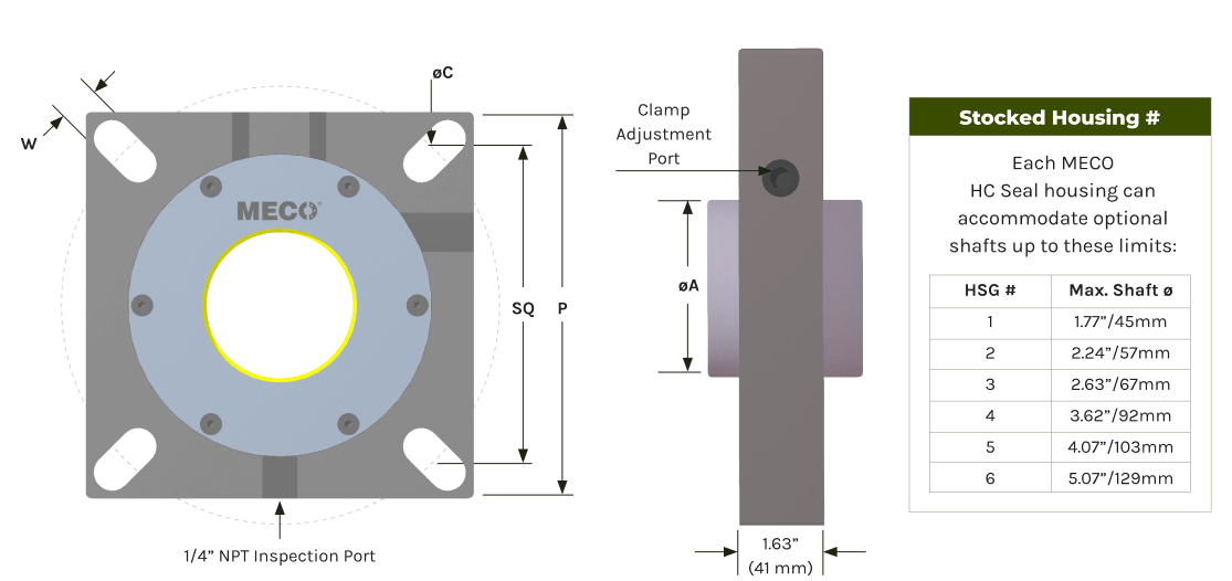 The MECO HC model seal is stocked in 6 standard inch and 10 metric sizes. These 16 seals can be easily converted for other shaft sizes and all fit within the 6 stocked housing (HSG) sizes. This allows the HC model seals to be sized for shaft diameters 5.07” (129mm) and smaller.